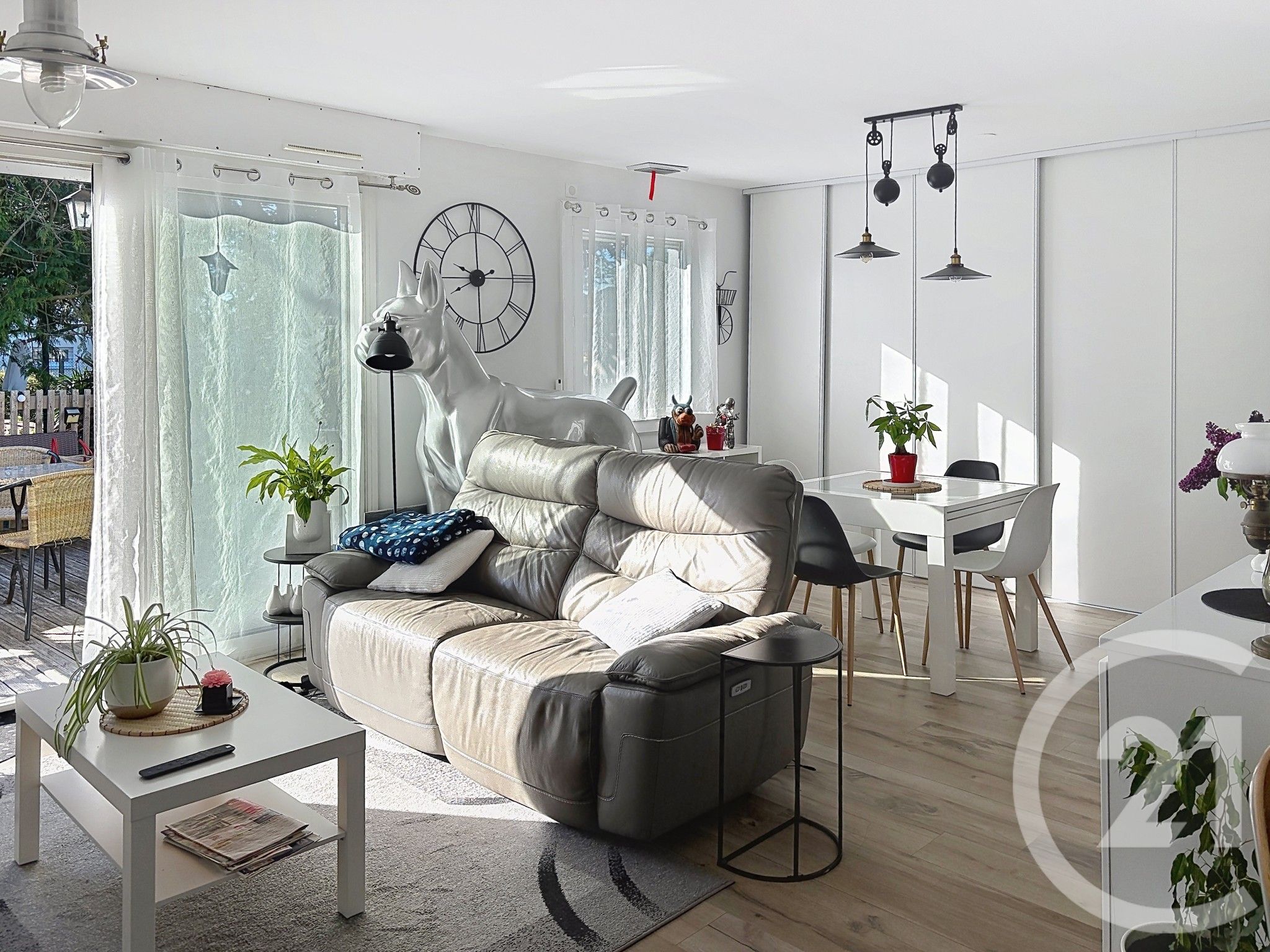 Passé la véranda d'entrée, vous accédez à un beau séjour lumineux avec accès direct à la terrasse et une cuisine ouverte.